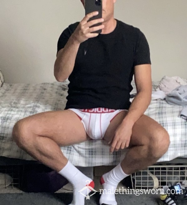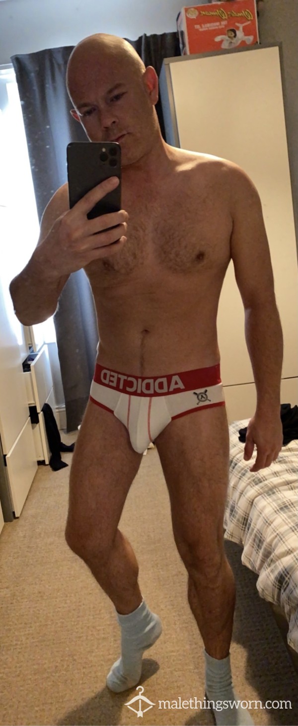 Stunning pair of white ADDICTED briefs, with red waistband and style trim, look how they cup and place emphasis on your bulge