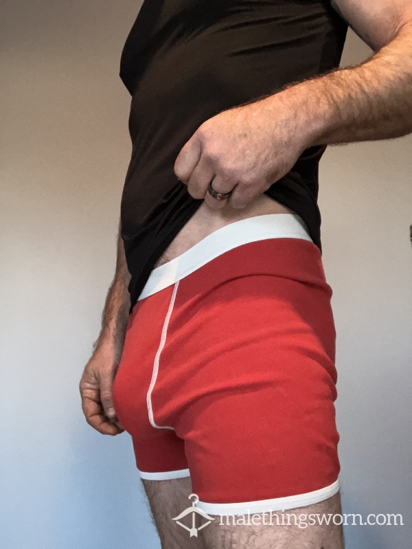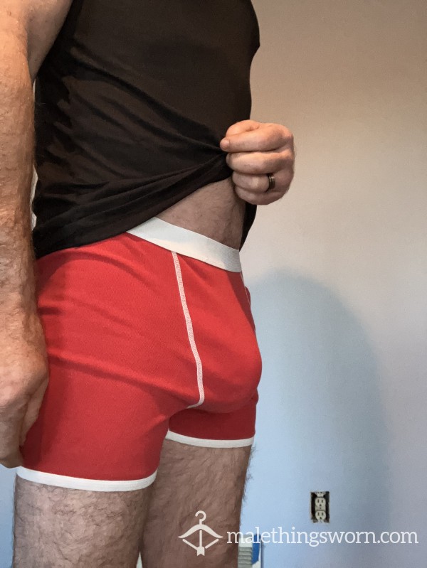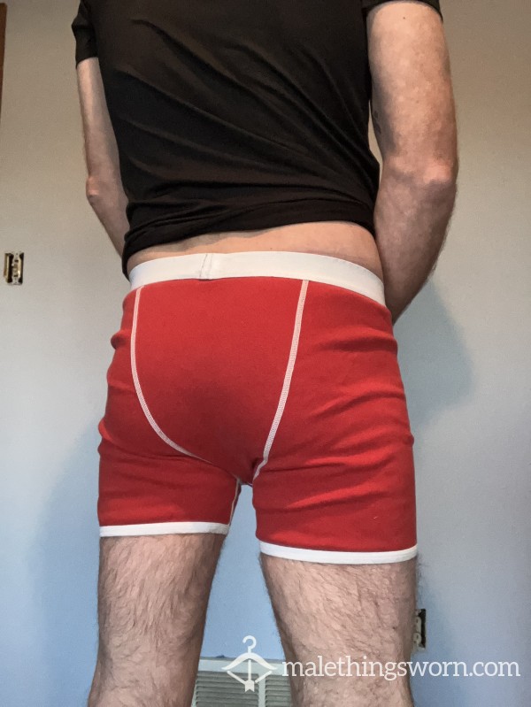Well worn pair of American Apparel boxer briefs. Size small. Color red. Can wear for 24 hrs before sending