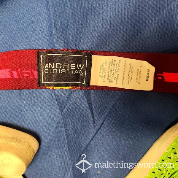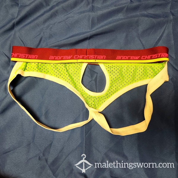 This is a neon green green open front jockstrap from Andrew Christian in size medium. It leaves nothing to the imagination, and make a nice bulge under clothing with the open front feature. The color is bold and will attract attention!