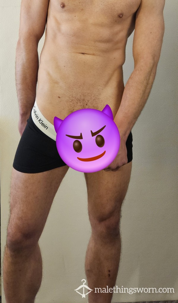 My worn black Calvin Klein boxers with that s**y little white waist band. I wore these to soccer practice today and was a bit too horny coming home in 'em so yeah... there's a c*m stain on these already! Message me if you want me to add another before sending these you way 😉