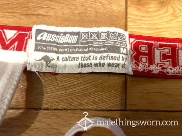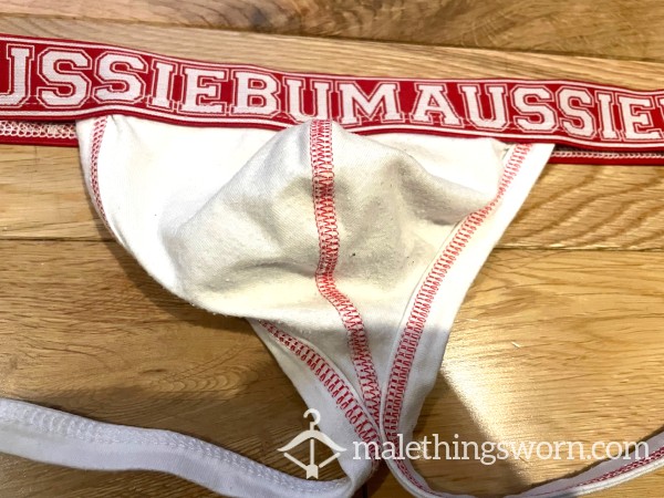 Aussieb*m s**y tight fitting White Jockstrap with Red stitching and waistband. Size M, Perfectly designed to show off your package and super comfortable too! I can wear it all day and night and during workouts and playtime and they get sweaty and man scented. Will wear it for 2 days straight or longer if you want, may even have a little pre-c*m in them. If you want I can c*m in it if you want for a little extra. Just message me with requests. Free UK postage. International postage is extra.