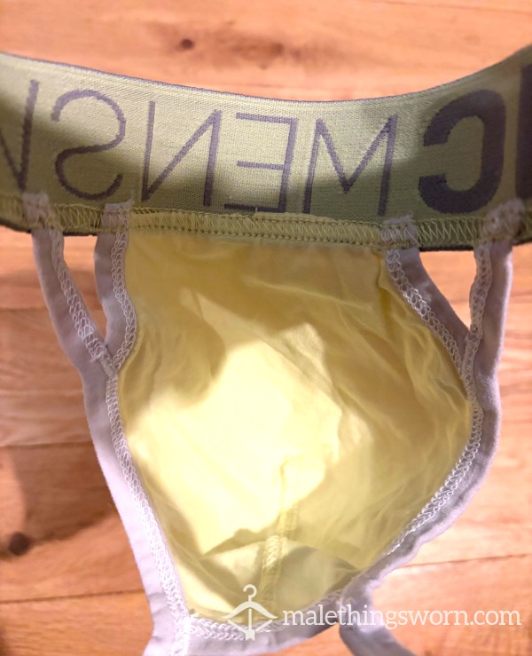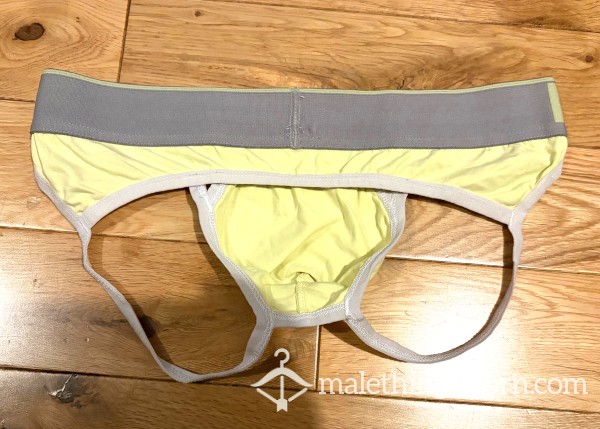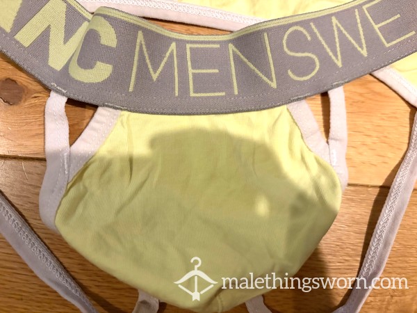 Blanc Menswear s**y tight fitting yellow Jockstrap with grey logo waistband. Size M, Perfectly designed to show off your package and super comfortable too! I can wear it all day and night and during workouts and playtime and they get sweaty and man scented. Will wear it for 2 days straight or longer if you want, may even have a little pre-c*m in them. If you want I can c*m in it if you want for a little extra. Just message me with requests. Free UK postage. International postage is extra.
