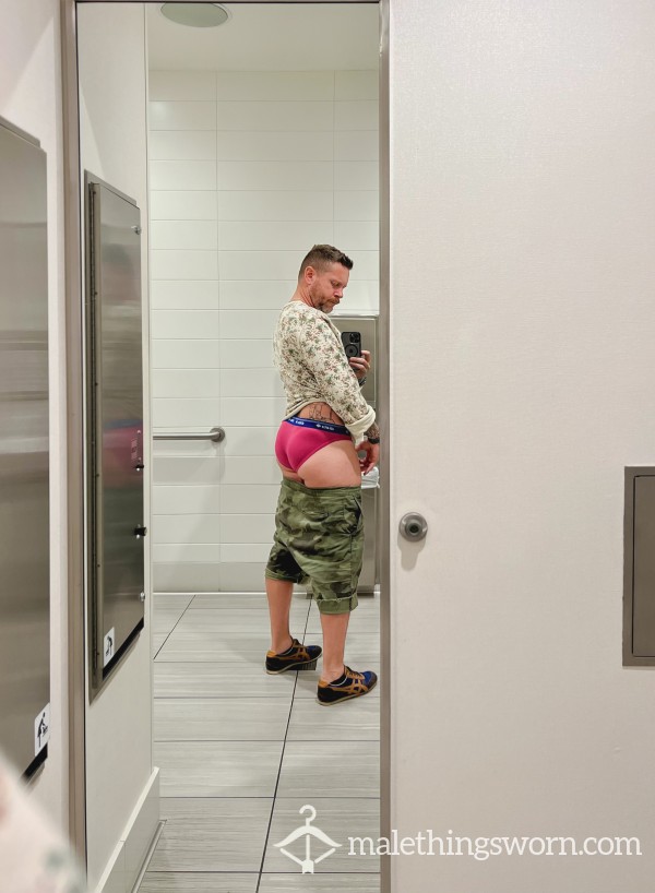 ¡Diseñados y hechos en México! Designed and made (and purchased) in Mexico. Pink sport brief with blue and white waistband. 80% polyester, 20% Spandex. Original owner. Frequent wear, 4 years. Model (me) is 5'8"/173 cm, 170 lb/77 kg. I love these briefs (and this brand) big time!