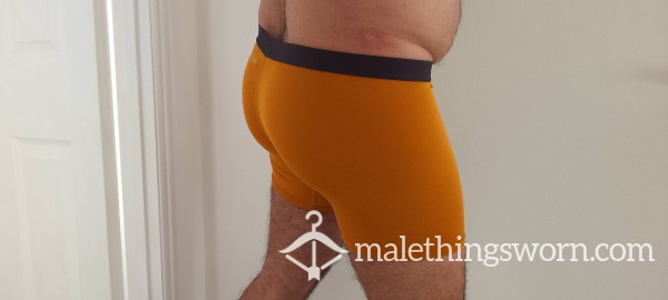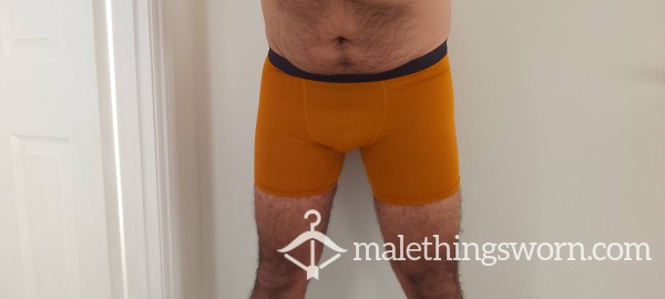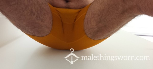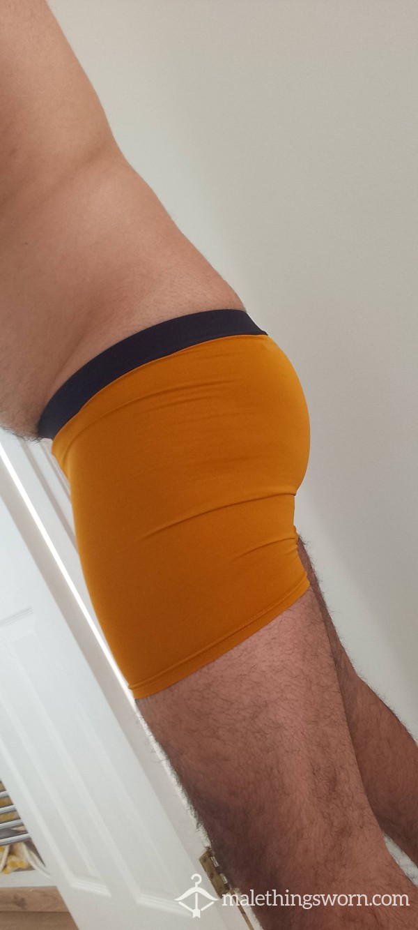Gold boxer shorts – size Medium. Worn and naturally broken in, giving them a softer feel and a comfortable, body-hugging fit. The stretch fabric sits snug and supportive, shaping well to the body.