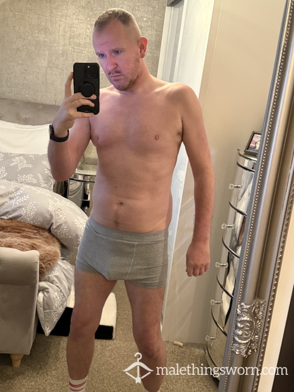 Worn grey Calvin kleins a small hole under the crotch area