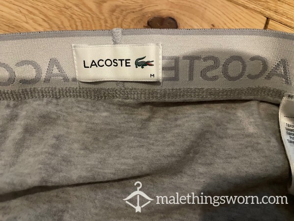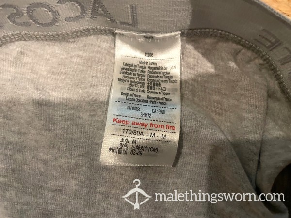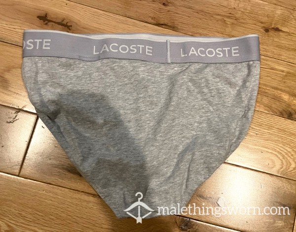 Men's Lacoste Grey Hip Briefs with green logo waistband Size M. I can wear them all day and night and during workouts and playtime and they get sweaty and man scented. Will wear them for 2 days and nights straight or longer if you want, may even have a little pre-c*m in them. If you want I can c*m in them if you want for a little extra. Just message me with requests. Free UK postage.