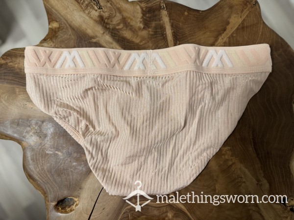 These white briefs are cotton with a little spandex, small and tight, with a pouch that barely contains...