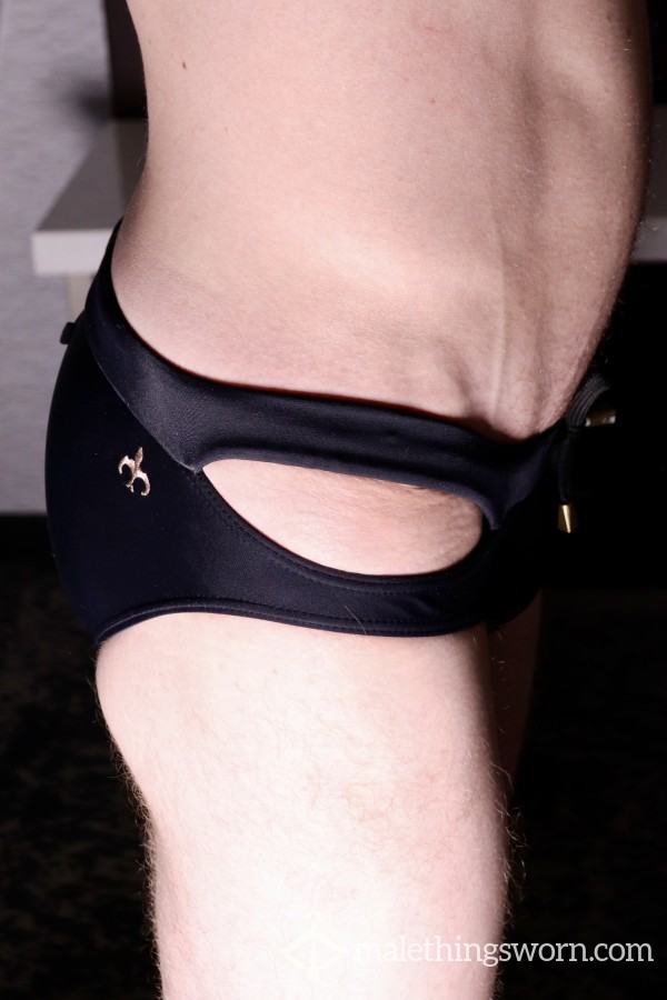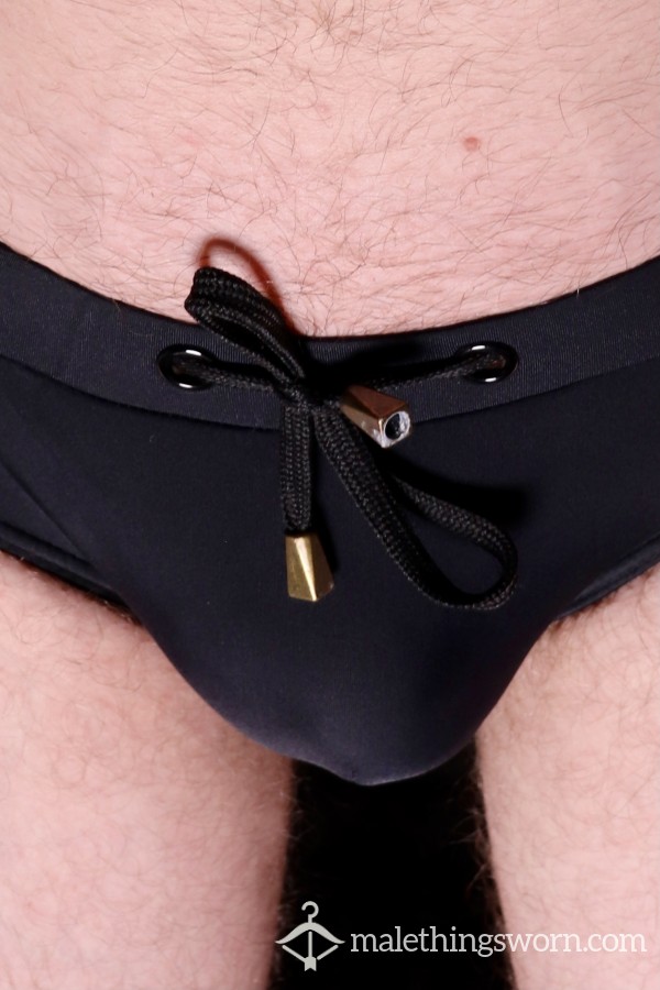 Size XS Marcuse Aperture Black Swim Brief Sp**do 80% Nylon/20% Spandex Slit on the side Elastic waistband and external drawstring Signature MARCUSE logo and back loop Worn many times Great condition