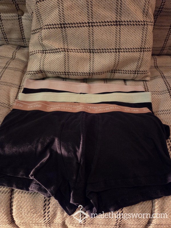 Mens ck trunk style boxers size L different colour band options. See pics. Price includes 1 day wear, pic and postage. Extra days wear and pic is £5 and c*m loads are £5 per load.