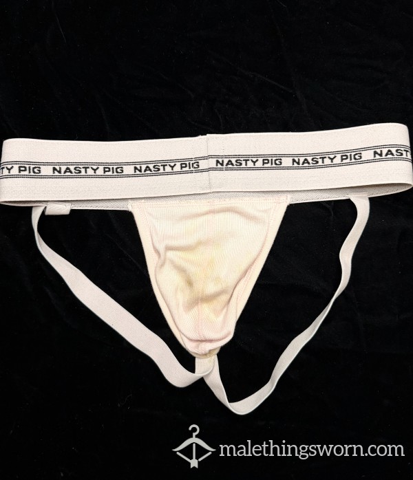 White Slazenger jockstrap, worn to a few sleazy events. Size small but plenty of room. Has a pouch...