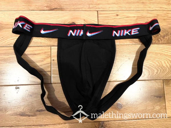 Nike Dri-Fit Cotton Stretch Black Jockstrap with red logo. Size M. Perfectly designed to show off your package and super comfortable too! I can wear it all day and night and during workouts and playtime and they get sweaty and man scented. Will wear it for 2 days straight or longer if you want, may even have a little pre-c*m in them. If you want I can c*m in it if you want for a little extra. Just message me with requests. Free UK postage. International postage is extra.