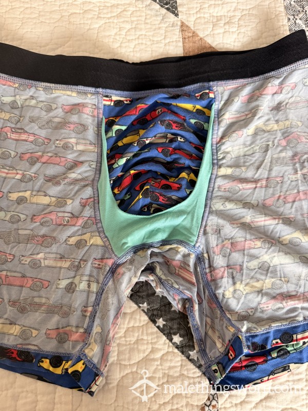 Worn boxers with mild stains on the front. Very comfortable, and will enhance your package nicely. Elastic is in great condition, no holes, and clean. Ready for use, haven’t been washed since last worn at work. That perfect blue color working man scent.