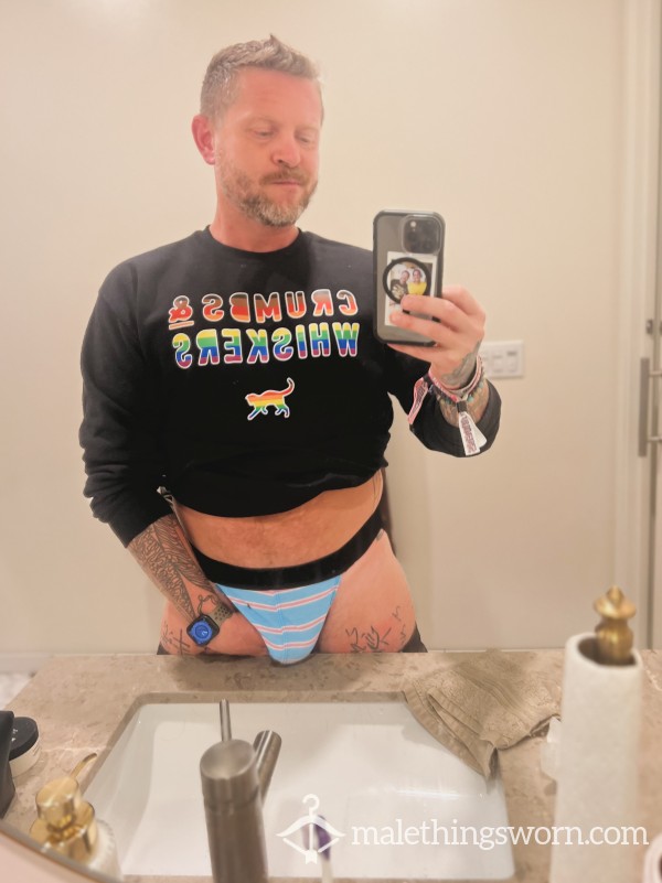 Rough Trade Gear jockstrap. Black elastic bands & jersey-cotton blue, pink, and white stripes. Original owner. Frequent wear, 4 years. Model (me) is 5'8"/173 cm, 170 lb/77 kg.