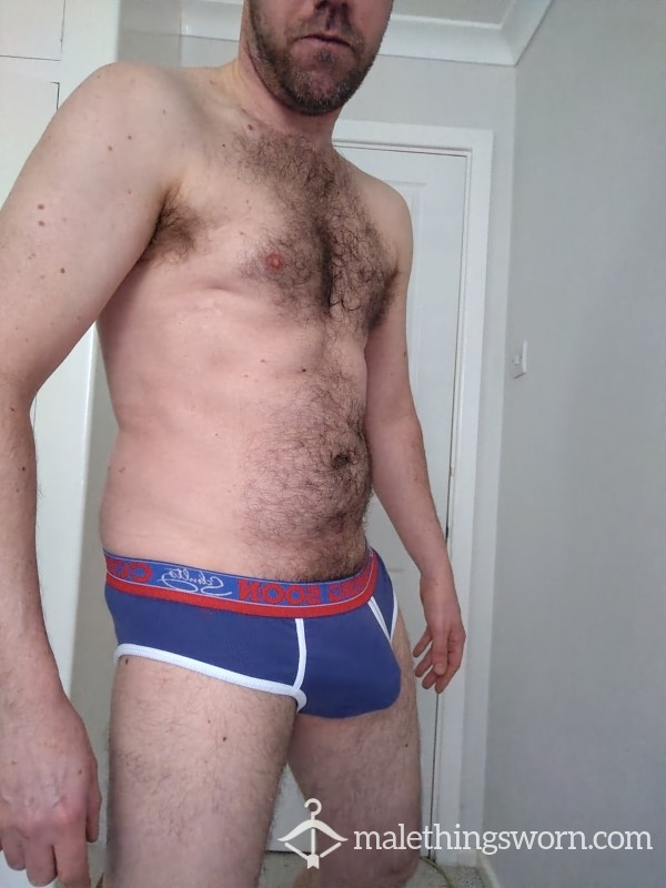 Schultz Coming Soon small briefs. Worn three days with big bush musky bollocks. Loaded