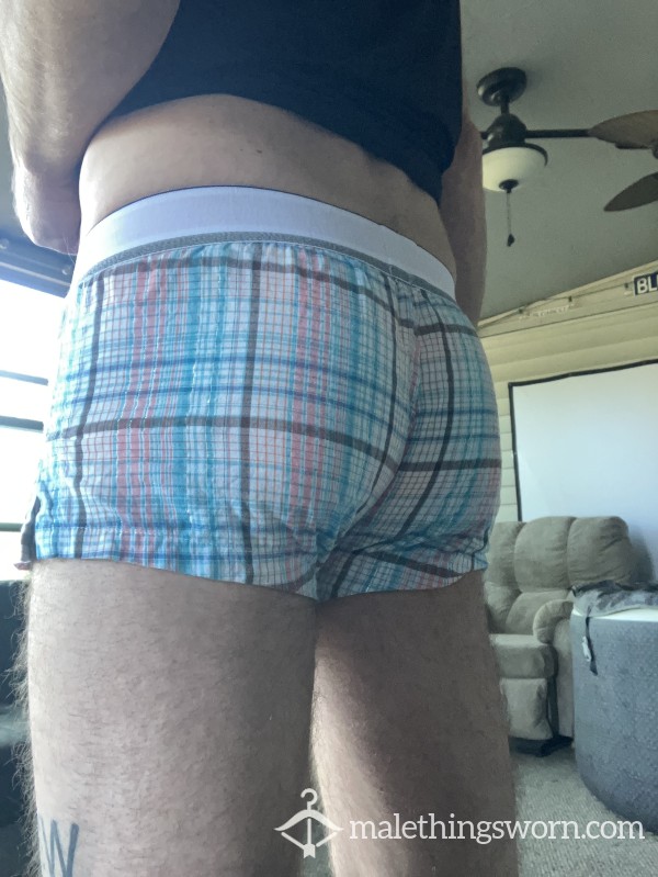 Worn pair of boxer shorts. Size large but that’s Asian size, fit like a small. Has inner pouch to keep everything in place.