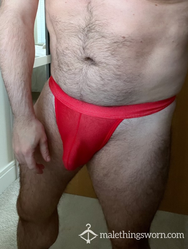 Sweaty mesh Red thong nicely worn & sweaty. All items are worn for 2 full days & a sweaty spin cla**. Love to custom your order with extra wear, sweat or a huge Scottish load 💦 Happy to add in an extra vile or 2 of fresh sweat or load to further customise your order 💦🐽