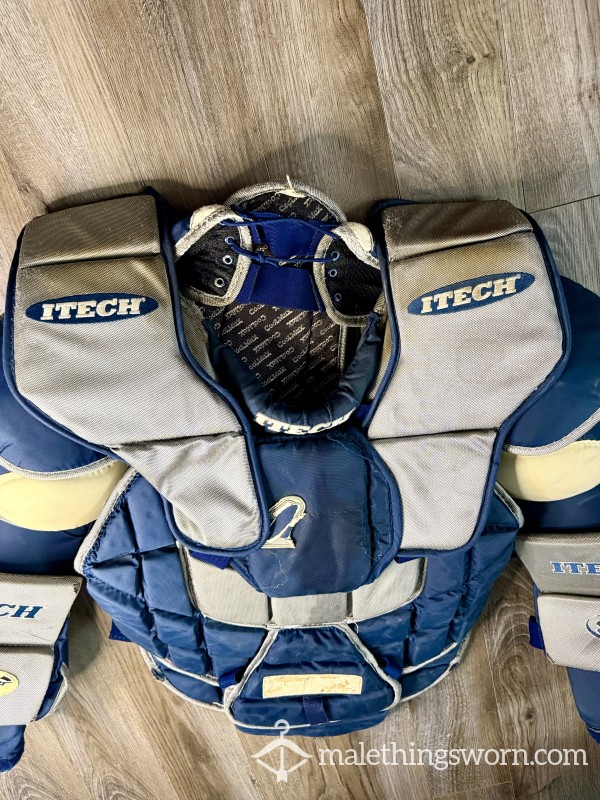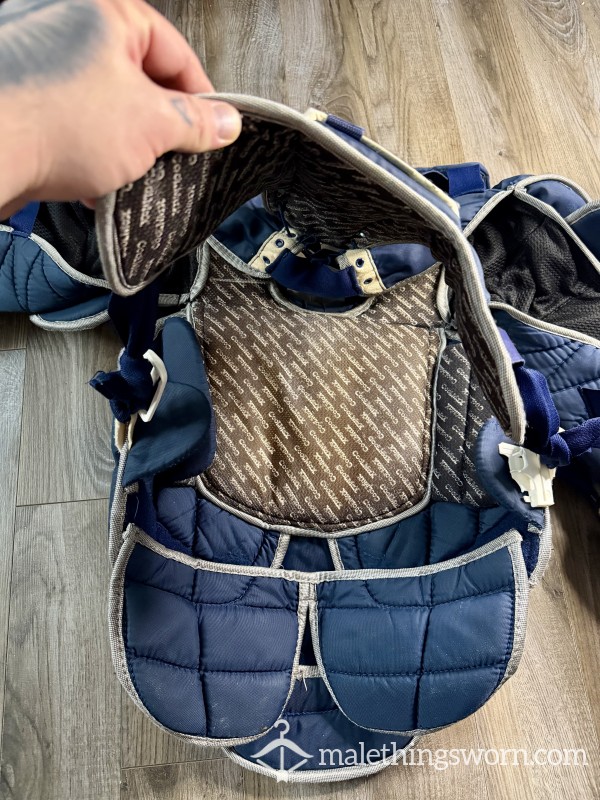 End of season locker room emptying. Hockey goalie chest protection is ripe and ready for use. It has been worn by two hockey players over the past decade and has never been washed. It is always thoroughly dried after practice. Please look at the pictures to get an idea of its condition. This item will be your new trophy🏆 . If you enjoy the smell of sports gear, this item is what you need to fill your room with that scent.