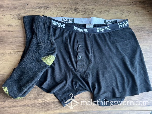 Both boxers and socks have been worn all week, at home, work, around the farm and while f**king. Soaked in c*ck and ball sweat, post-f**k a** juice, prec*m and pi*s dribbles! π