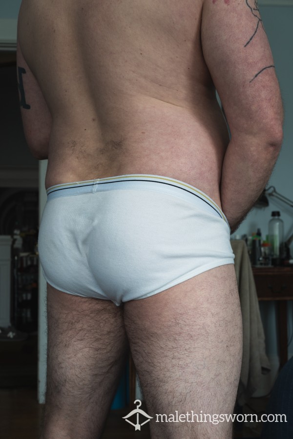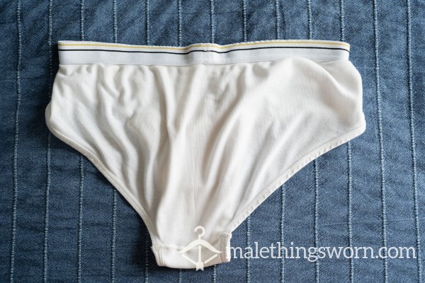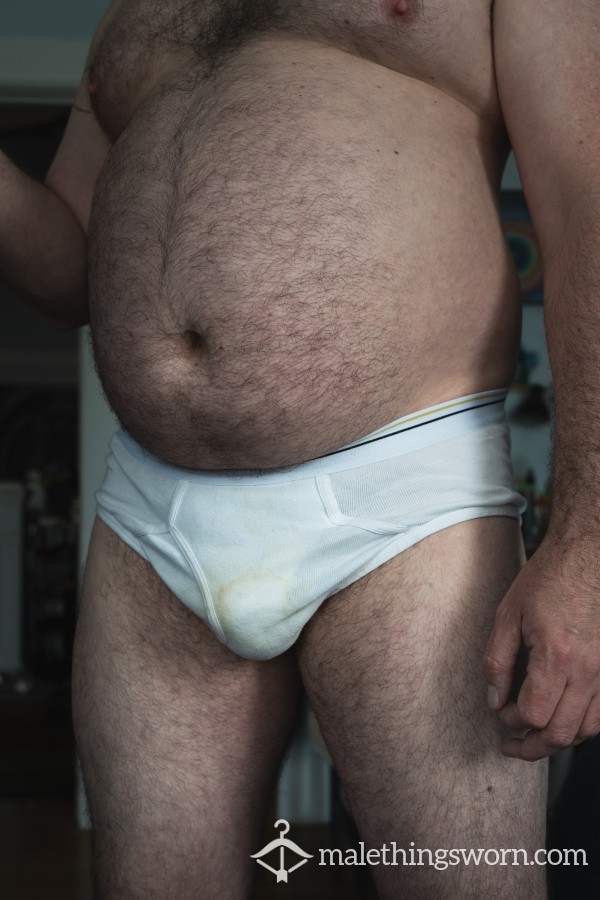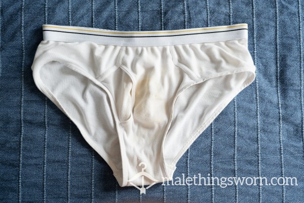 The pair pictured is already on its way to a friend, but were worn for 4 days, smell amazing. Most of the yellowing is from leaking prec*m. I have a bunch more broken in pairs I can pop on for a few days and get to a similar condition. Happy to discuss extras.