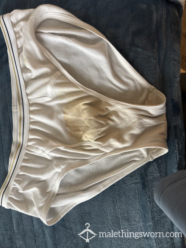Used white Jockmail jockstrap, drenched in sweat from brutal workouts and full of my musky scent from daily...