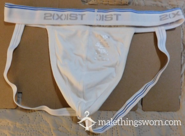 This is a medium 2(x)ist Stretch white jockstrap with blue trim. It is gently used and waiting the cradle your junk and frame your a**. Customization is available.