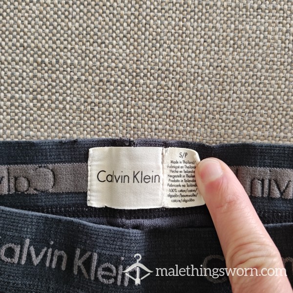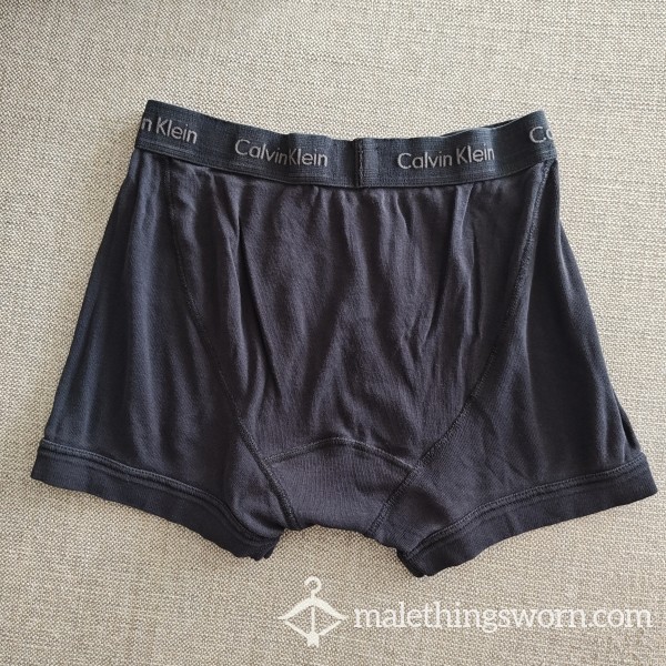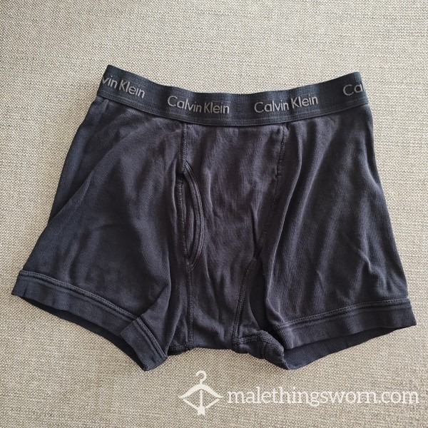 Black Calvin Klein boxerbriefs in Size M. They've been worn many times and are somewhat distressed but no rips or tears and come freshly laundered unless you add upgrades for days worn or loads added.