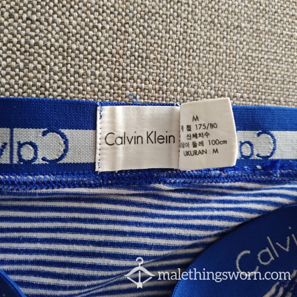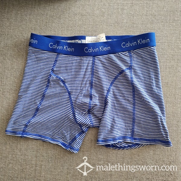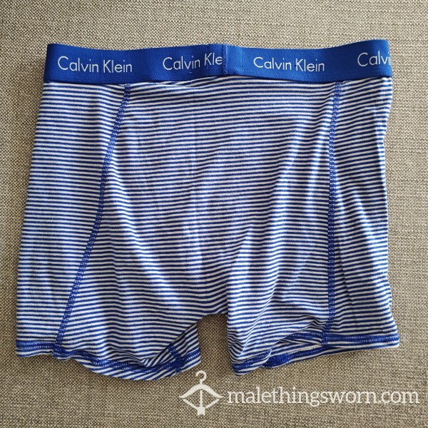 Blue striped CK boxerbriefs in Size M. In great condition and come freshly laundered unless you add upgrades for days worn or loads added.