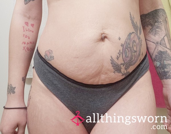 Full back grey panties! I've had these girlies for quite a while. They're a size small with a perfect fit. Soft material. This little a** just gobbles them up. So they'll come drenched in my scent.