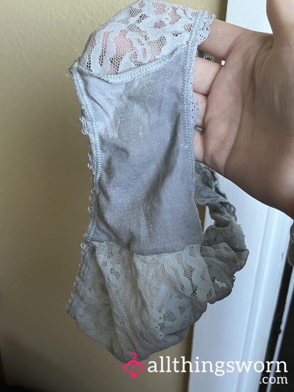 s**y red panties. Worn for years and wearing now, about to sleep in them. Old stains on and...