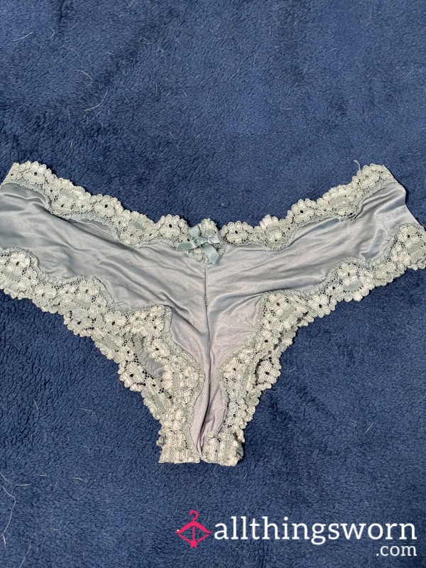 Light blue satin with lace trim Victoria's Secret panties - these are definitely a favorite of mine. So soft against my smooth pu**y. Worn to order. Comes with 24 hour wear doing all daily activities. Immediately sealed after wear and shipped to you in discreet plain mail bubbler. Comes with proof of wear photos in inbox.