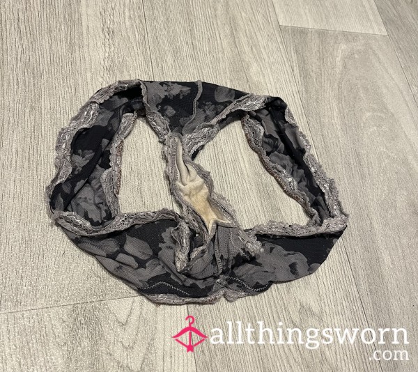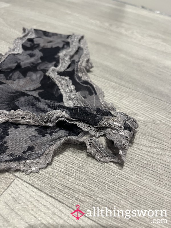 Black and grey silver flor*l panties with lace edging and bow detailing. Well worn with staining and signs of wear. Can we freshly worn on purchase 🖤