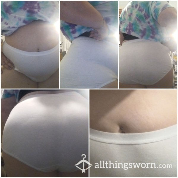 So these are fullll backs! LoL these come up super high and are the 50s style "bloomers" they are all cotton with an elastic waistband. I have white and I think dark blue maybe dark tan. These will be worn for 24 hours even though I recommend longer so you can get the full experience.