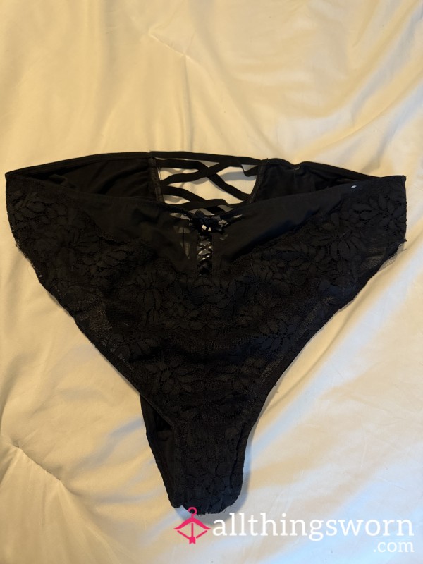 Cheeky style black lace with criss cross design over the top of the a**, little bow in front. Wear for 24 hours and sealed fresh, want them cream filled? Let met know 😉