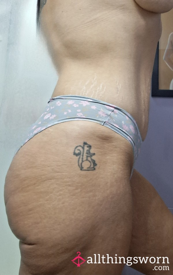 Very soft gray panties with pink flor*l pattern. Mid coverage, stretchy and practically seamless🩷