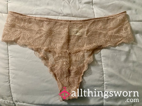 “My colors are blush and bashful. Your colors are pink and pink.” Many of you won’t get the reference but it’s from one of my favorite movies and these lace cheeky panties make me think of the color blush. They are unbelievably soft and were worn for 24 hours. Not only did they survive an 8 hour work day on the road but a nice 35 minute sweaty walk. My favorite way to unwind before bed is a little solo play and this pair has evidence of that fun.