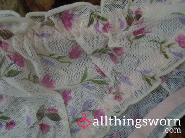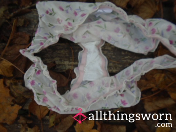 Peach Lacey panties, worn all day walking, doing house work, doing yoga...