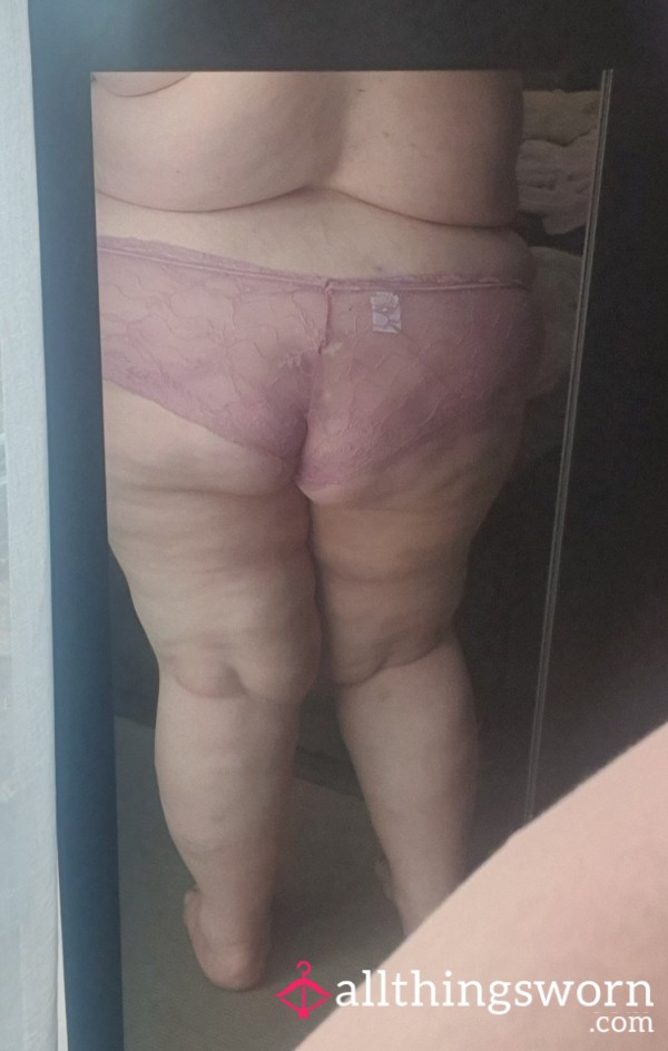 Purple thong, worn during some alone time with a double ended di**o. Smells rich and sticky.