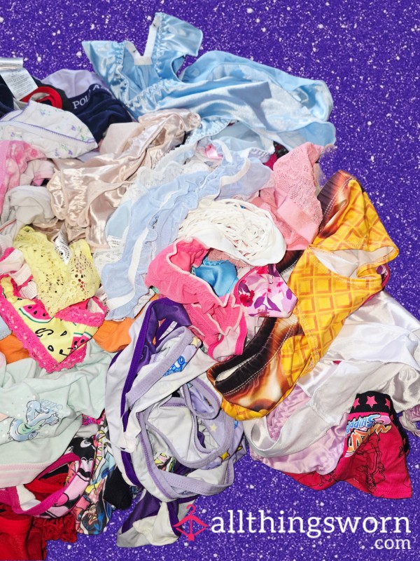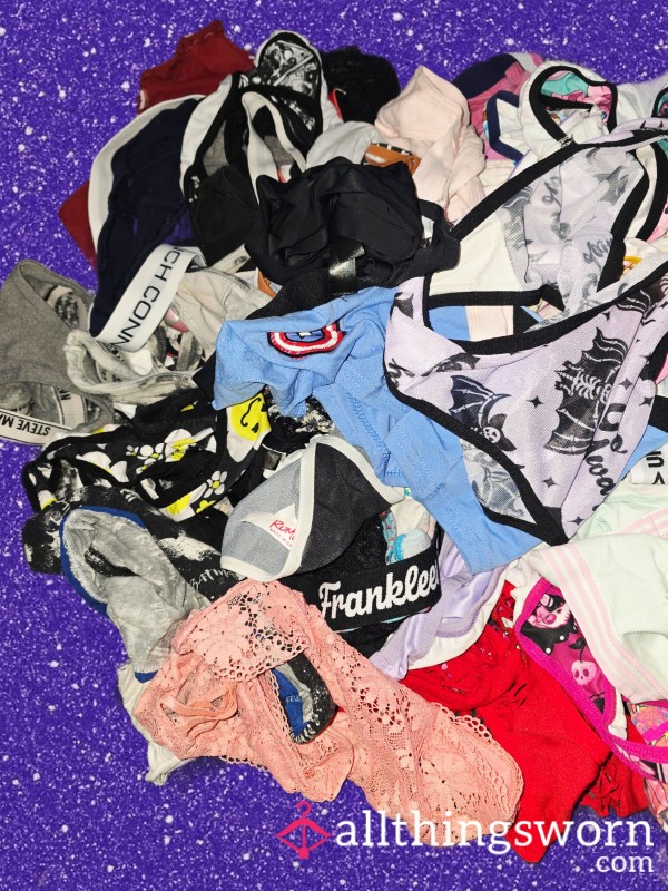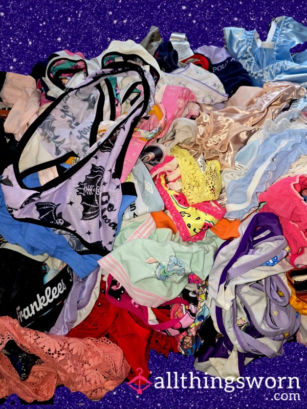I have an abundance of panties. So so many!! Most of them new pairs. Unworn, tried on. Many others extreamly worn, holes in, bleached from pu**y, stretched, worn out and end of life. All of which are looking to find new homes. 🥹