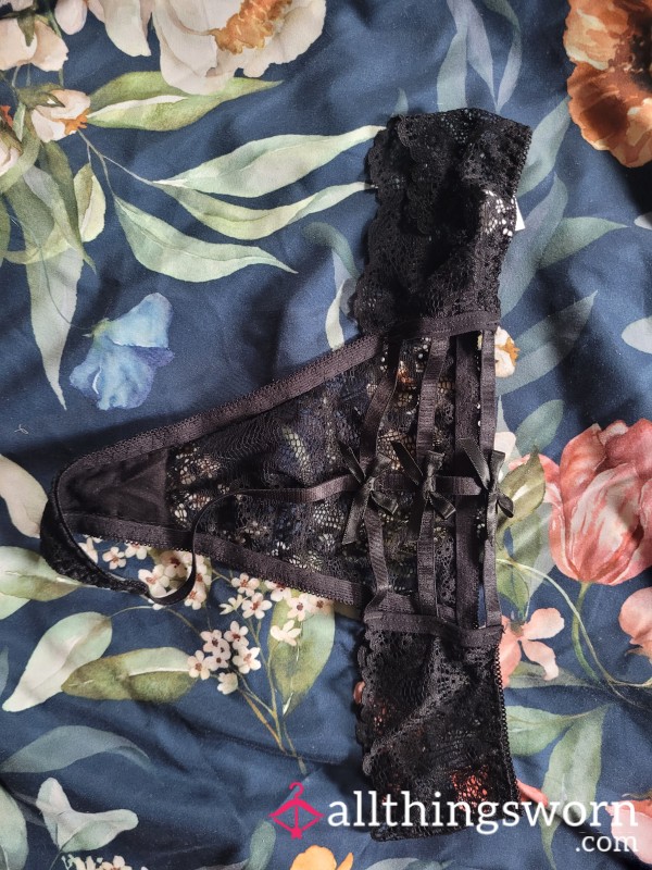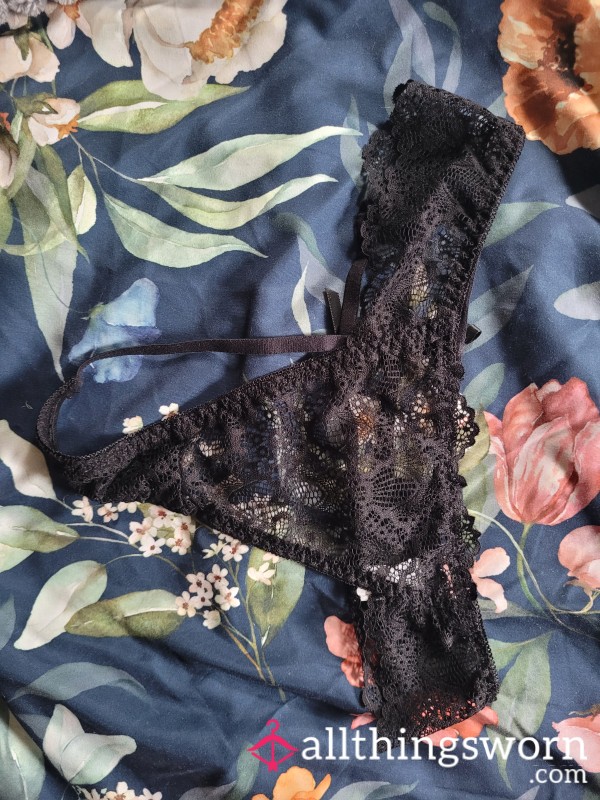 Gorgeous black lacy panties, size small, with a full days wear and personal photo proof of wear...