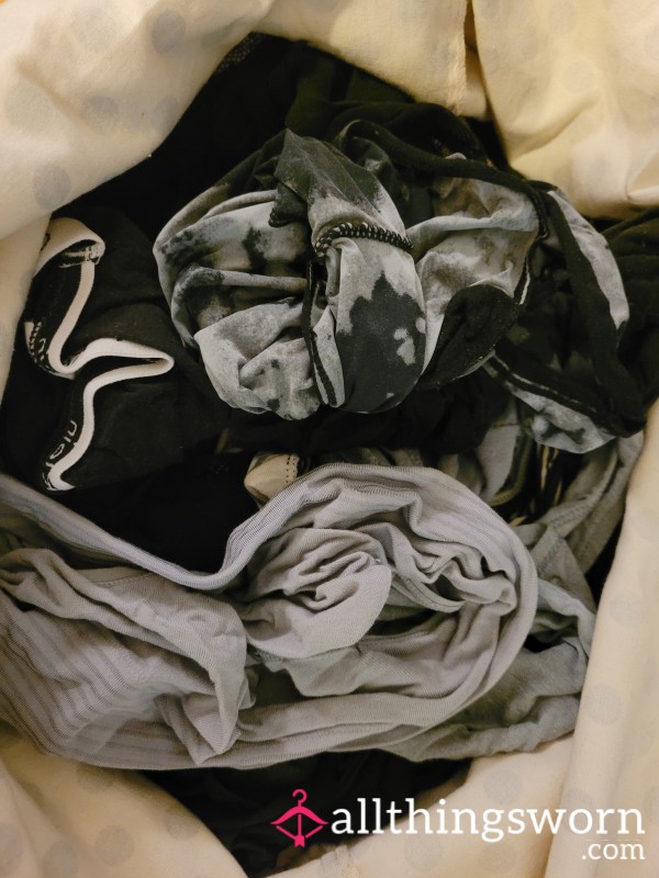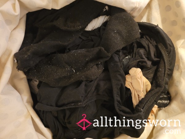 Over 80 pairs of dirty panties, including Fenty, Jockey, Felina, and Calvin Klein, about four pairs of stinky socks, and a pair of stained gray shorts