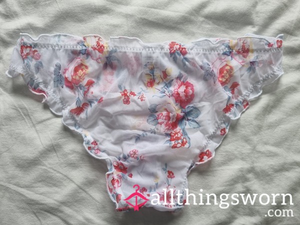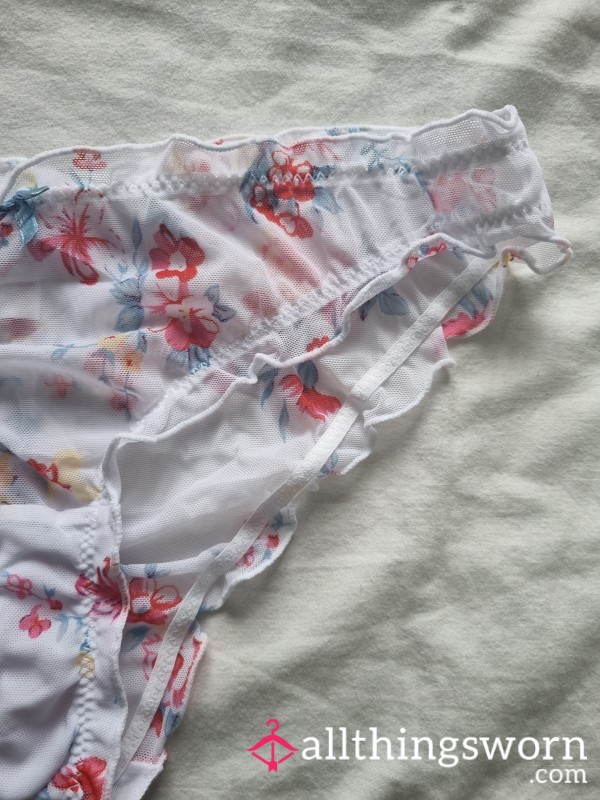 Luxury panties for the more discerning collectors, these beautiful delicate white mesh panties with a lettuce edge and pretty flor*l design 🤍