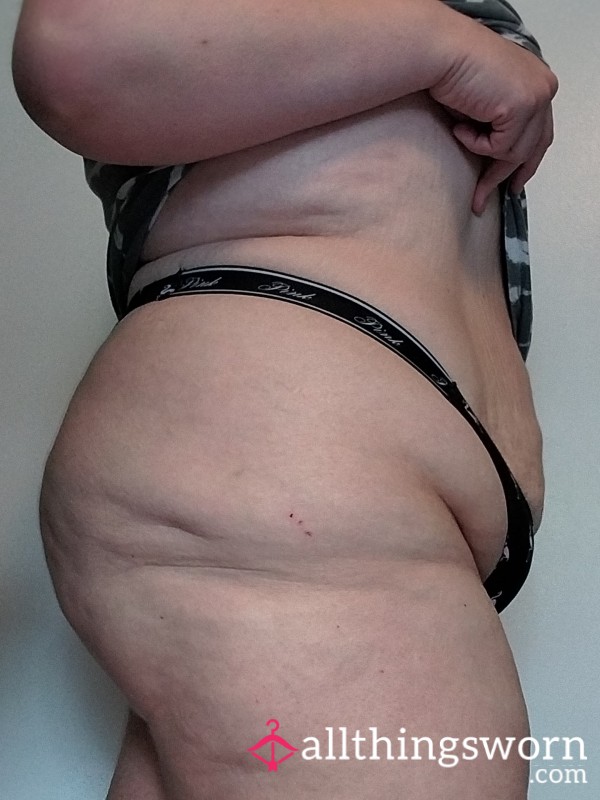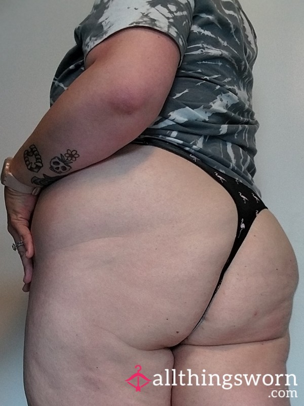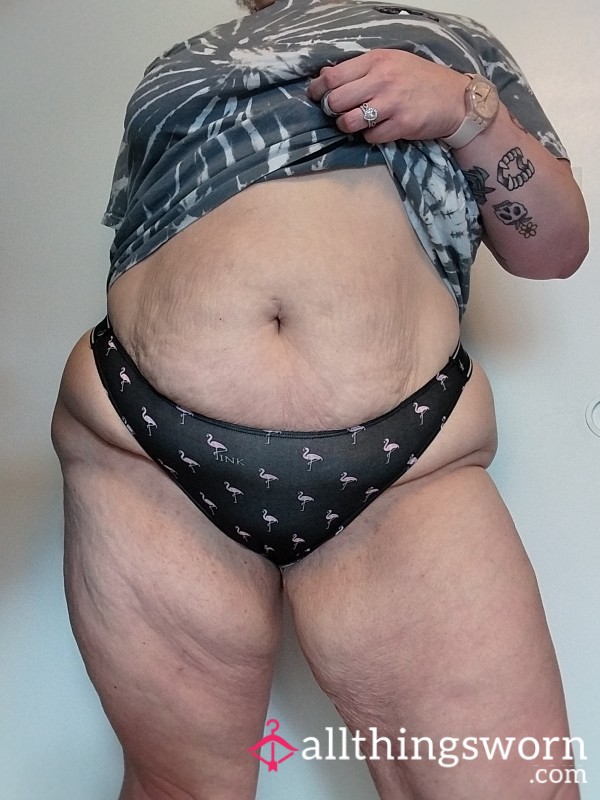 This Victoria’s Secret black thong features a bold flamingo design—but the real heat is in the scent. Worn for 24 hours tight against me, it soaked up every sweet drip, squeeze, and sultry sigh. 🌺