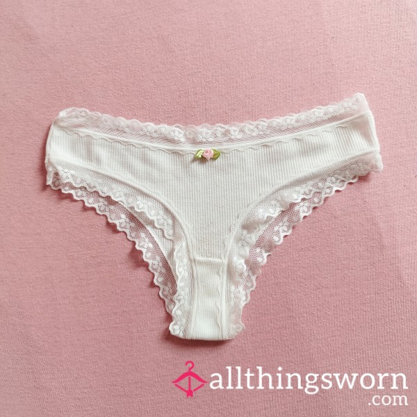These panties are really soft and cozy, and they’re such a pretty white color! They have little lacy edges that feel light and frilly, like a princess dress. And right in the middle, there’s a tiny pink flower with green leaves—it’s so cute and tiny, like a little decoration just for me! They feel gentle and nice to wear, and they’re my favorite because they’re comfy and look sweet too!