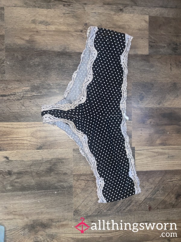 So worn out, I wear them all the time at work. Size 2xl satin with lace trim, black and white polka dot panties. Buy today and I will wear them just for you. Each additional day is $5. Extra Kinks or photos upon request.
