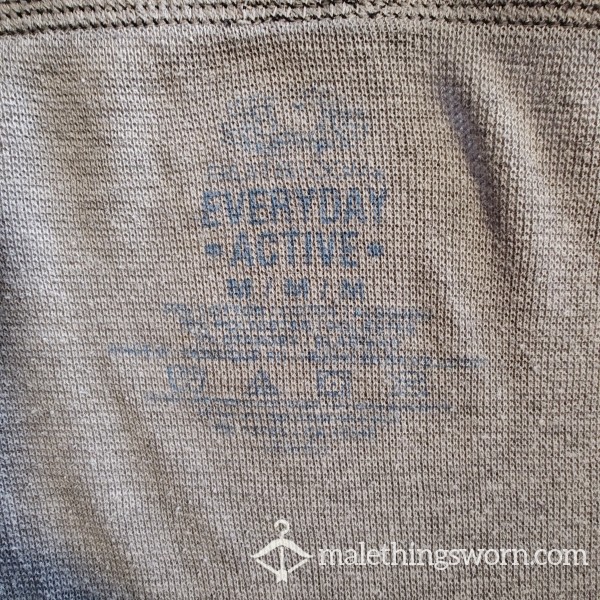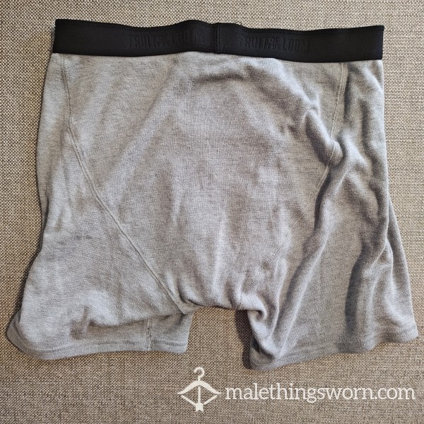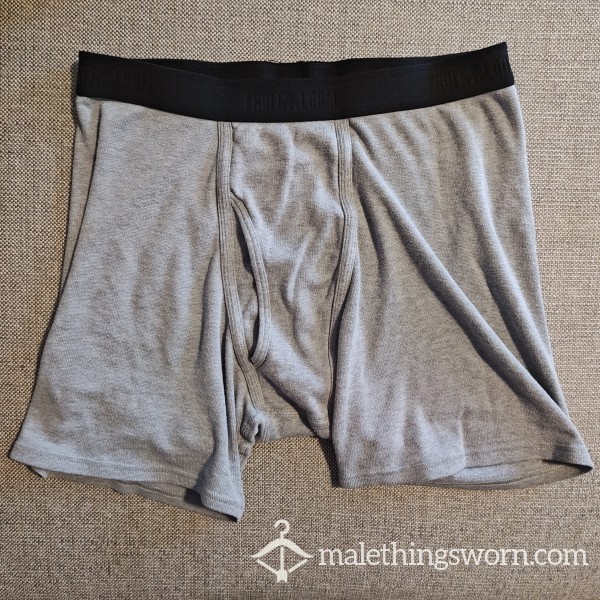 Heather gray Fruit of the Loom boxerbriefs in Size M. These are well-loved, having been worn many times. They're faded, have some pilling, and waistband a little stretched but they're still complete and functional. They come freshly laundered unless you add upgrades for days worn or loads added.