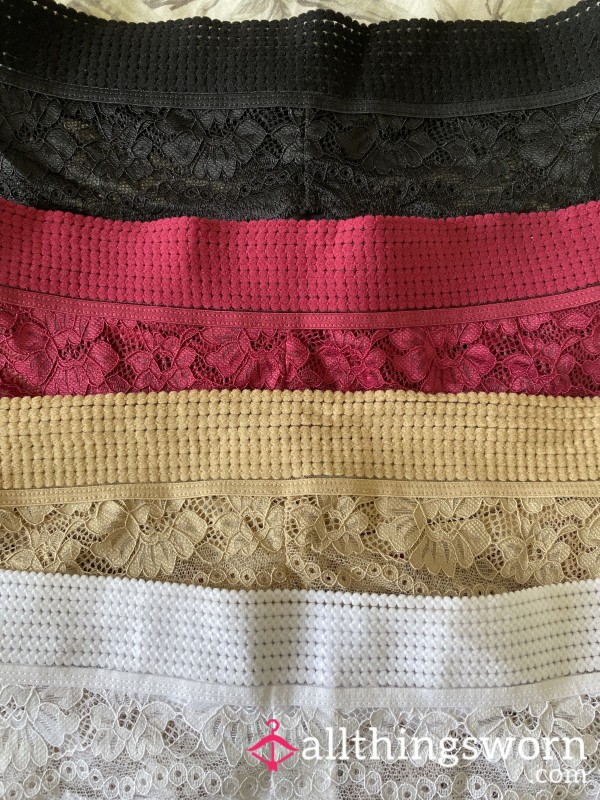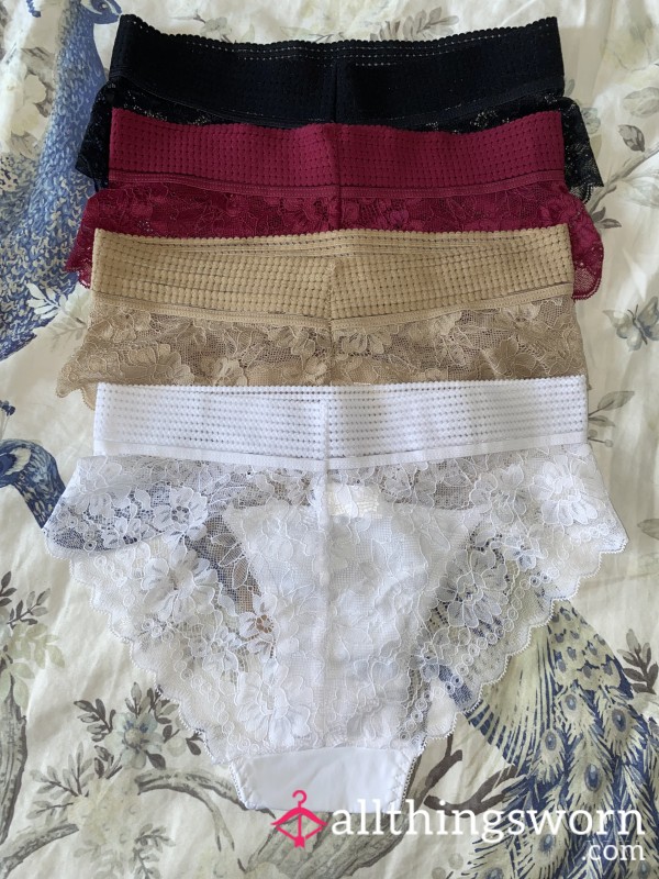 Lace blue and black thong. Worn many times, these have been a faithful workout pair (oh boy 😈)...
