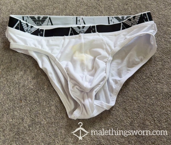 Well worn white Armani briefs with blue waistband. Size M.