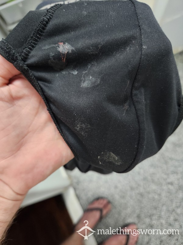 Bench boxers, black, soft cotton but burst with sweat. Been sat in them all day, proper heat and...