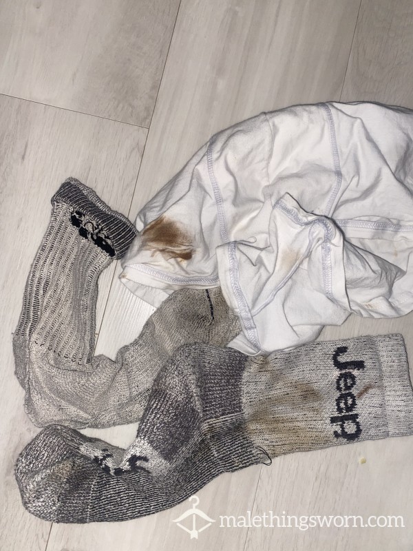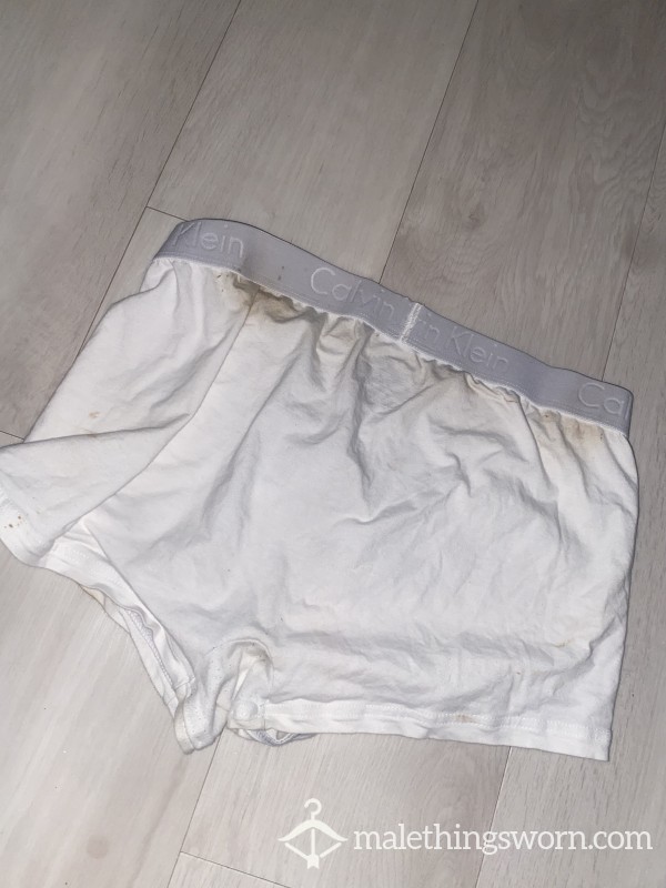 Work material stains on the outside of the boxers and other stains on the crutch.