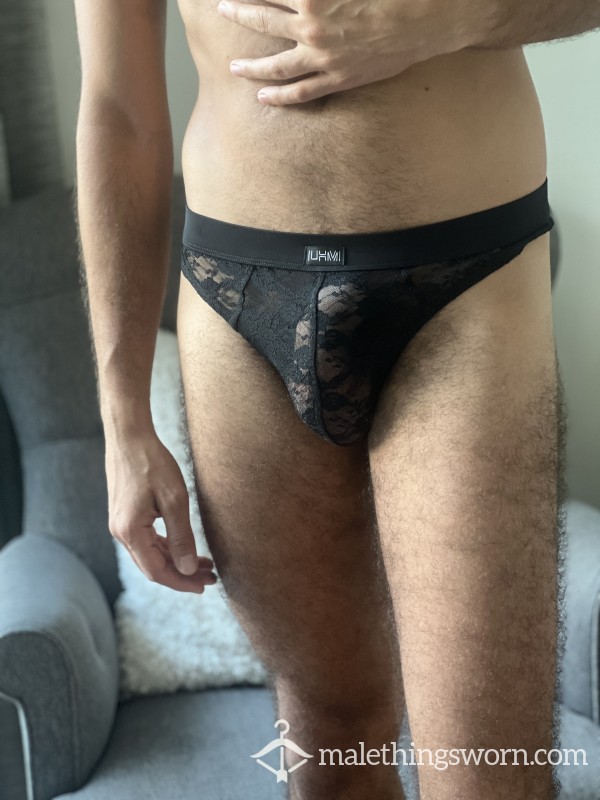 Straight from Wonderland ... this black lace thong has been worn tight and close, paired with my heavy boots for a raw, rugged edge. Worked up with sweat and body heat, the lace clings in all the right places, leaving it infused with musk and scent.